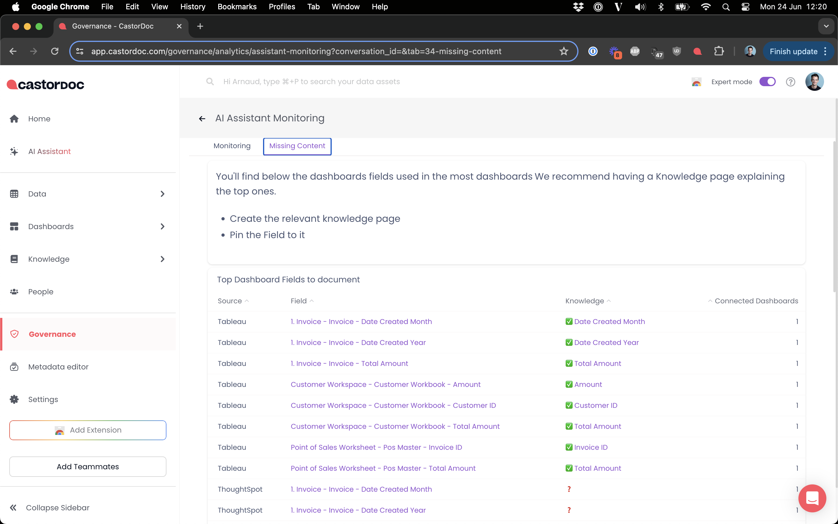 On the tab "Missing content" you'll find the most used fields in your BI tool. You'll be able to see if these popular fields are documented.
