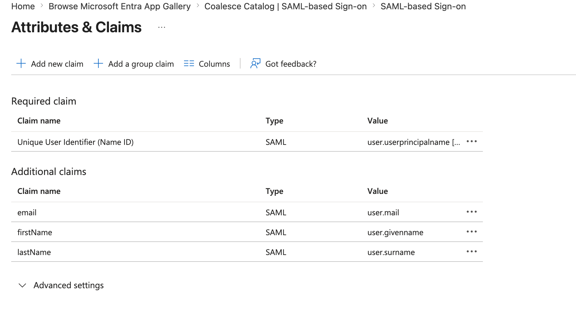 Configure Azure AD authentication for Catalog using SAML. In this guide you'll create an Azure AD app, configure claims, and add the certificate to Catalog.