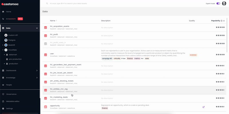 On this interface, for a given source, you will see all databases and schemas Catalog has access to. You can choose which ones you want to display to your users in our app by simply checking or unchecking them.