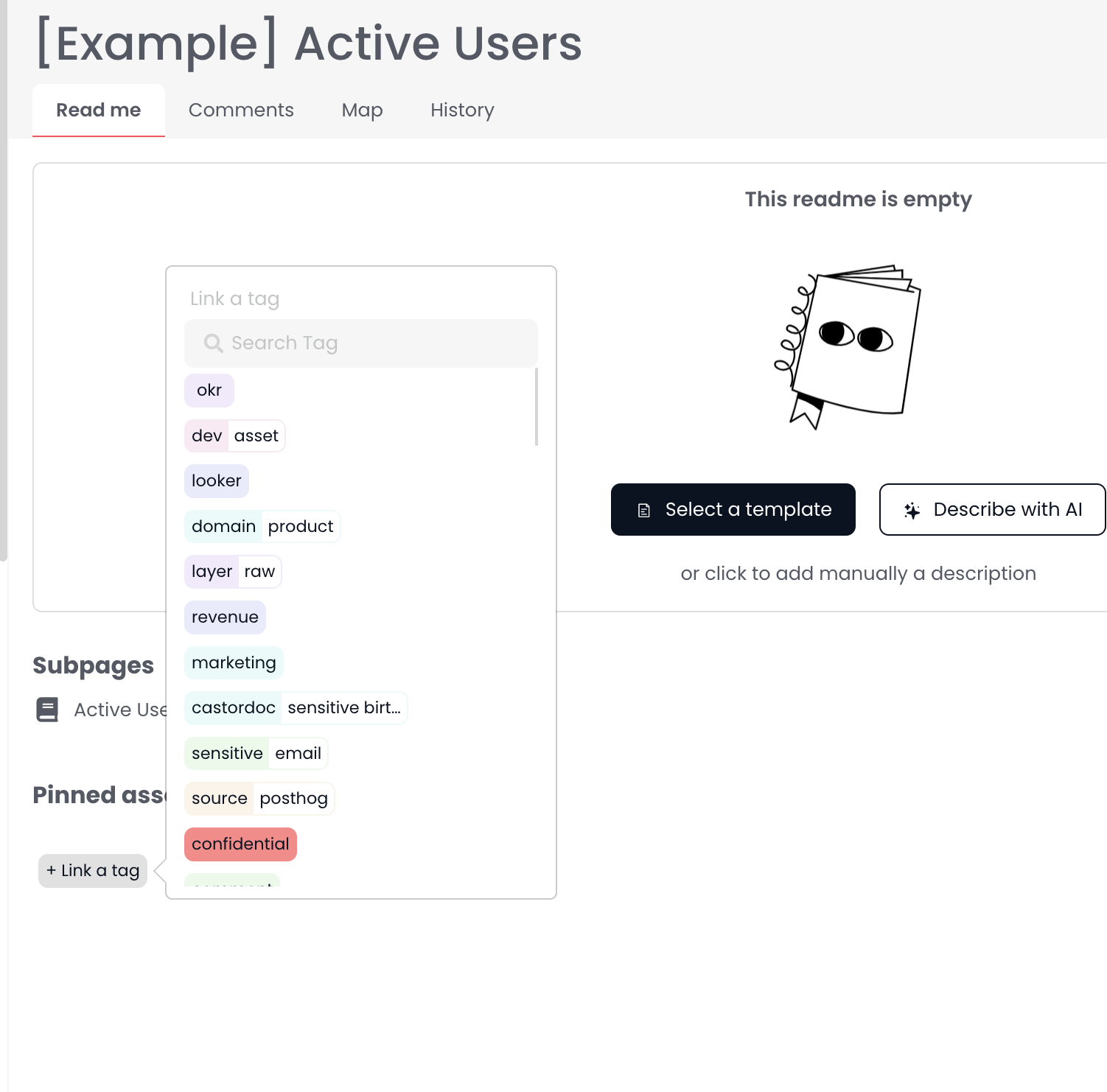 - Tags: tags can be used to describe assets. They are common for all users of a company.