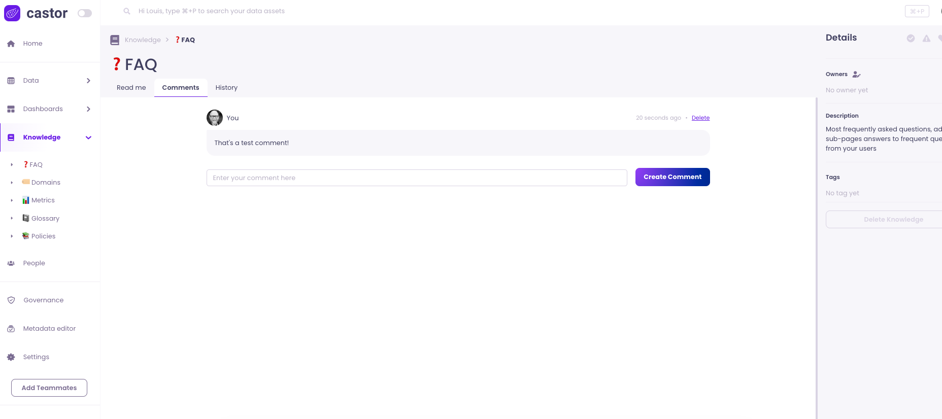 Each entry is composed of a Home, Comments, and History tab. You can nest knowledge page in one another.