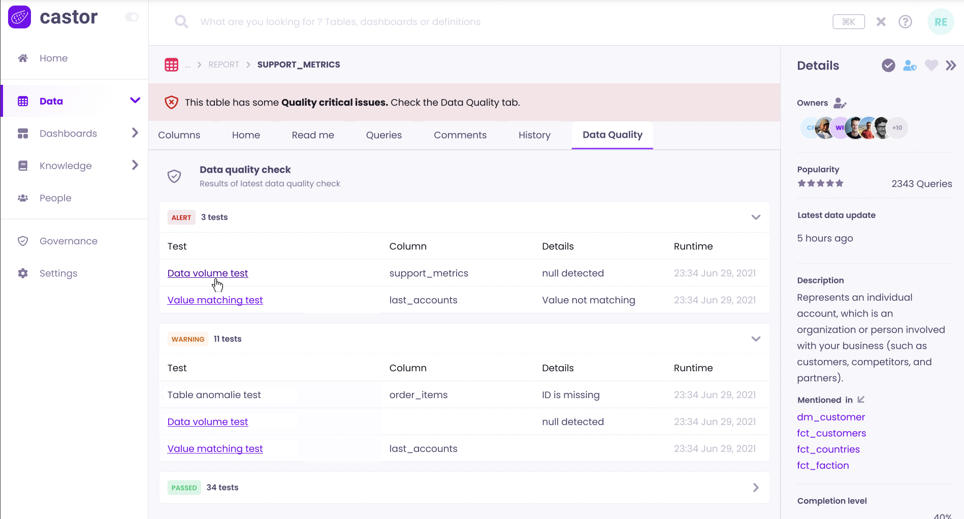 See data quality when browsing tables, along with a detailed breakdown of the tests and statuses.