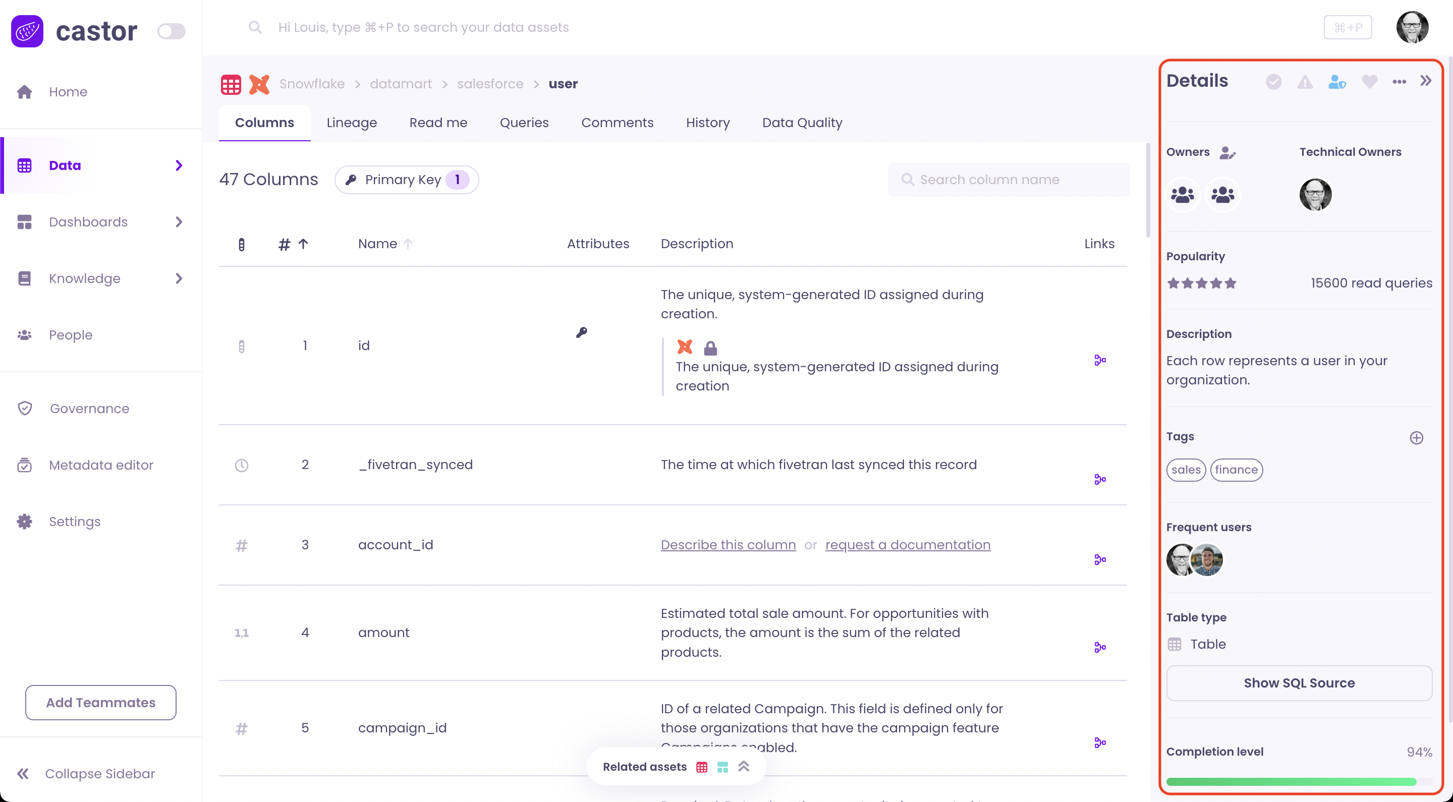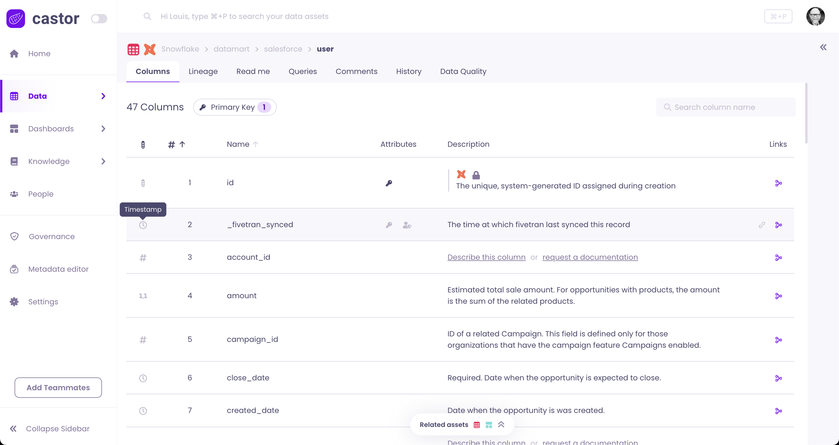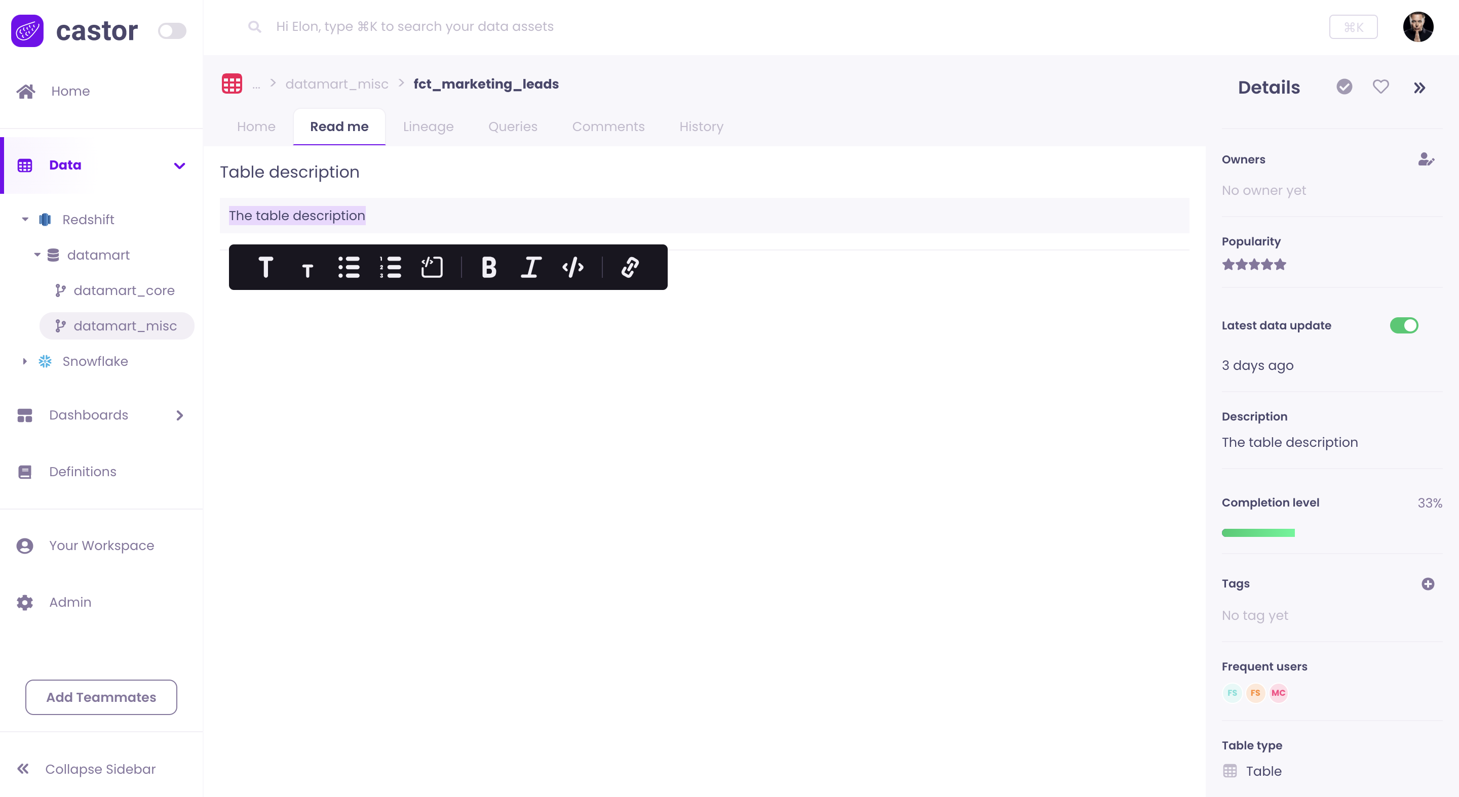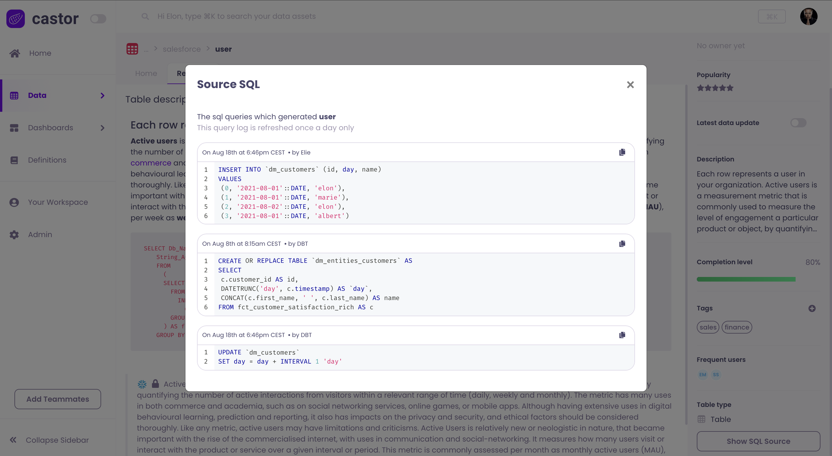 - Castor will centralise all the documentation you have already completed. The imported descriptions will be tagged with the logo of its source and will be immutable. Classic sources would be dbt or column comments in your warehouse