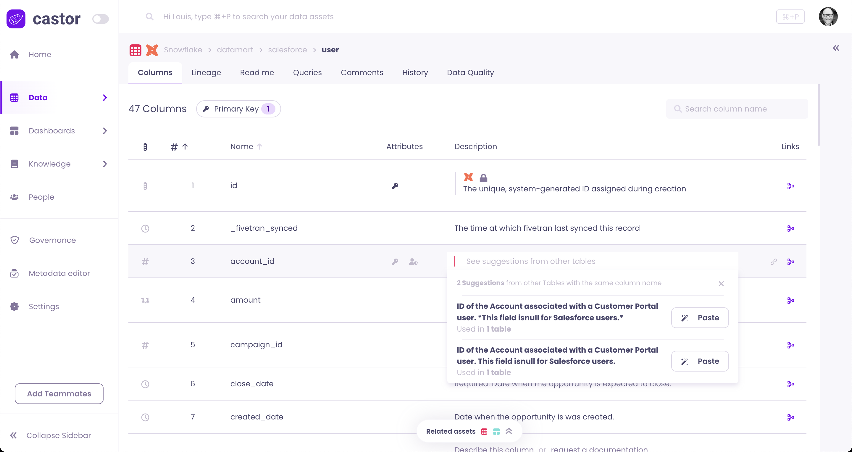 - Auto complete: if you have already filled out the description of the same column in another table, Castor will suggest it to you
