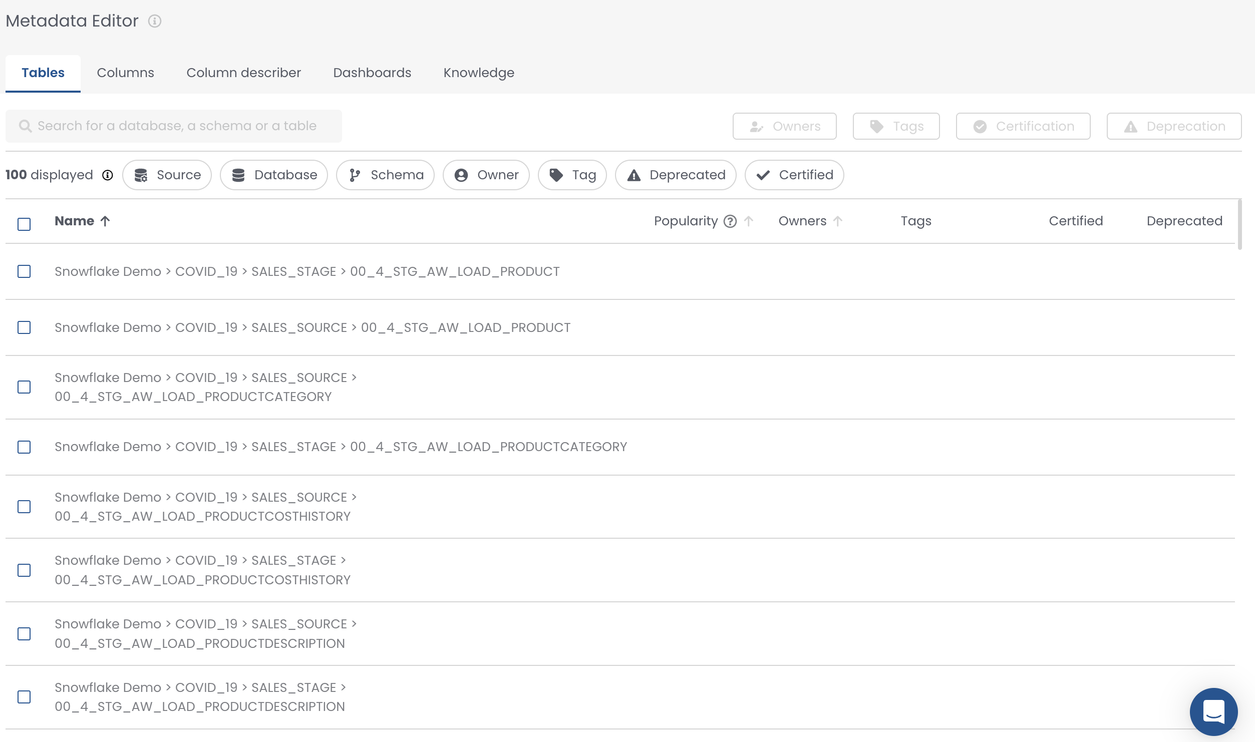 Select the tables you want to modify (you can filter by database, schema, tag, and/or owner)