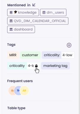 Catalog retrieves metadata from all your warehouses and viz tools, those metadata can include all your tags. In the right sidebar you'll see imported tags with a lock on.