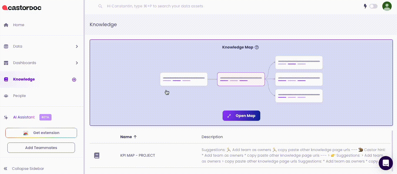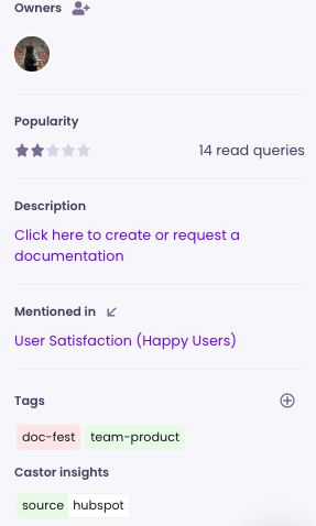 Additionally, Catalog creates a Knowledge page allowing your users to see all tables and dashboards using data from a specific source (hubspot in the above example)