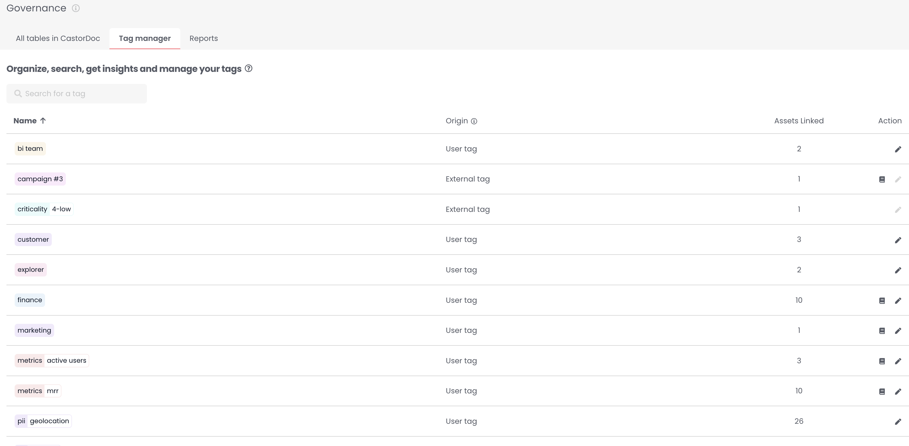 For each tag you will find the number of assets linked to it and the origin of the tag. Origins can be: