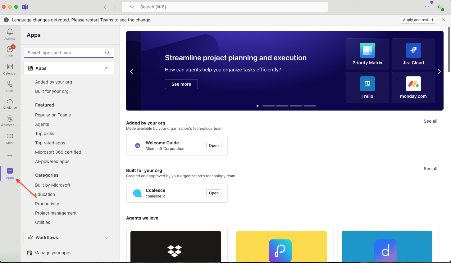 - Open Teams: In the Microsoft Teams desktop or web client, select Apps on the left navigation.