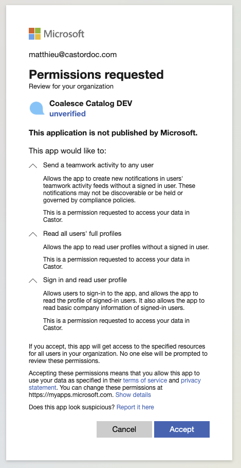 Administrative Consent: Once the admin has consented, you will be redirected back to app.castordoc.com/settings/integrations, where a confirmation toast will appear indicating the installation was successful.