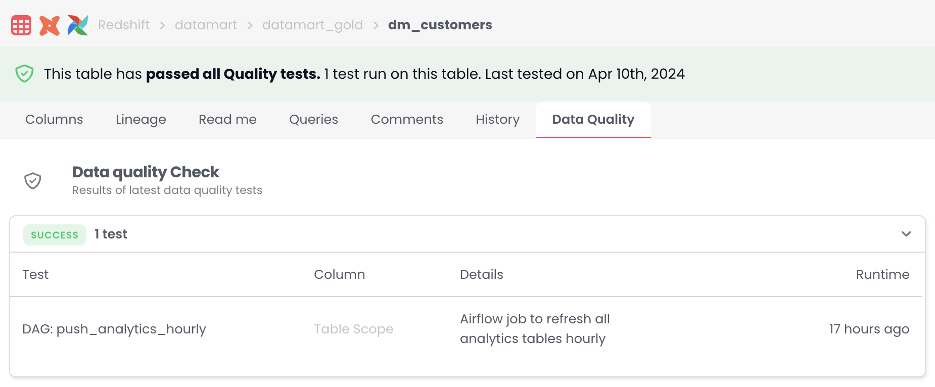 Catalog links the URL of each DAG to the tables they materialize and display the status of the DAG in the Data Quality table.