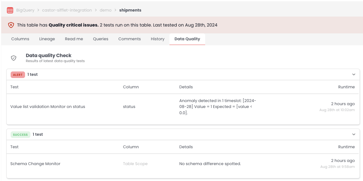 2 Sifflet Checks ran on the table shipmet, 1 succeeded and 1 raised an alert