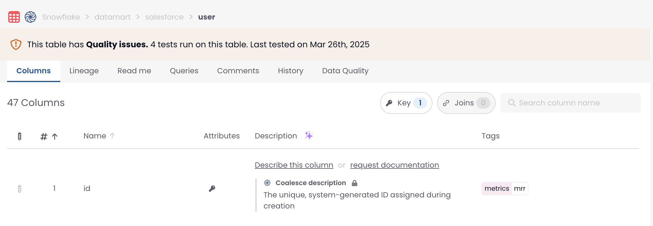 Pull in external table and column descriptions directly from Coalesce, ensuring your documentation stays consistent and up to date across platforms. → This feature currently supports: