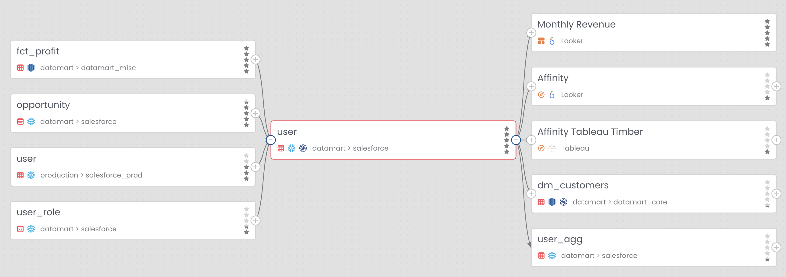 See Coalesce-built tables marked with the Coalesce logo directly in the lineage graph. This allows for fast troubleshooting and intuitive exploration of upstream dependencies and downstream consumers.