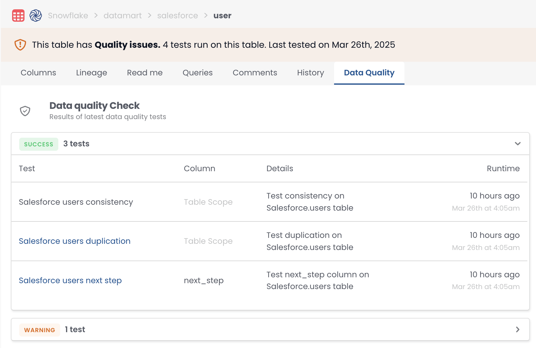 Activate Coalesce Quality as a Data Quality Source to bring test results into the Catalog. This helps teams proactively identify issues and surface data quality insights alongside technical metadata.