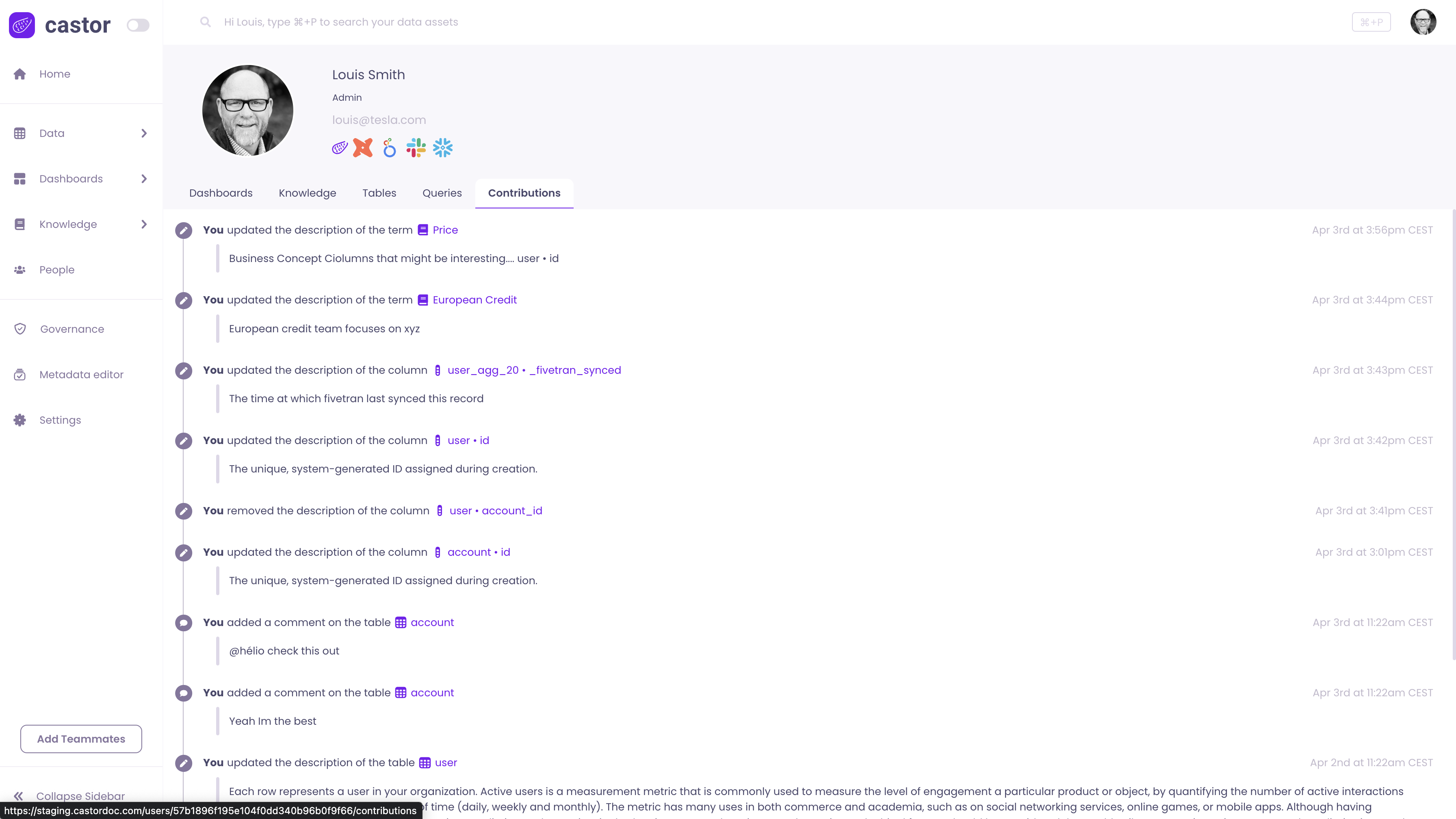 You can view all your contributions to the platform, including content you've created, edits you've made, and comments you've left. This is a great way to keep track of your progress and see how you and your coworkers are contributing to Catalog.