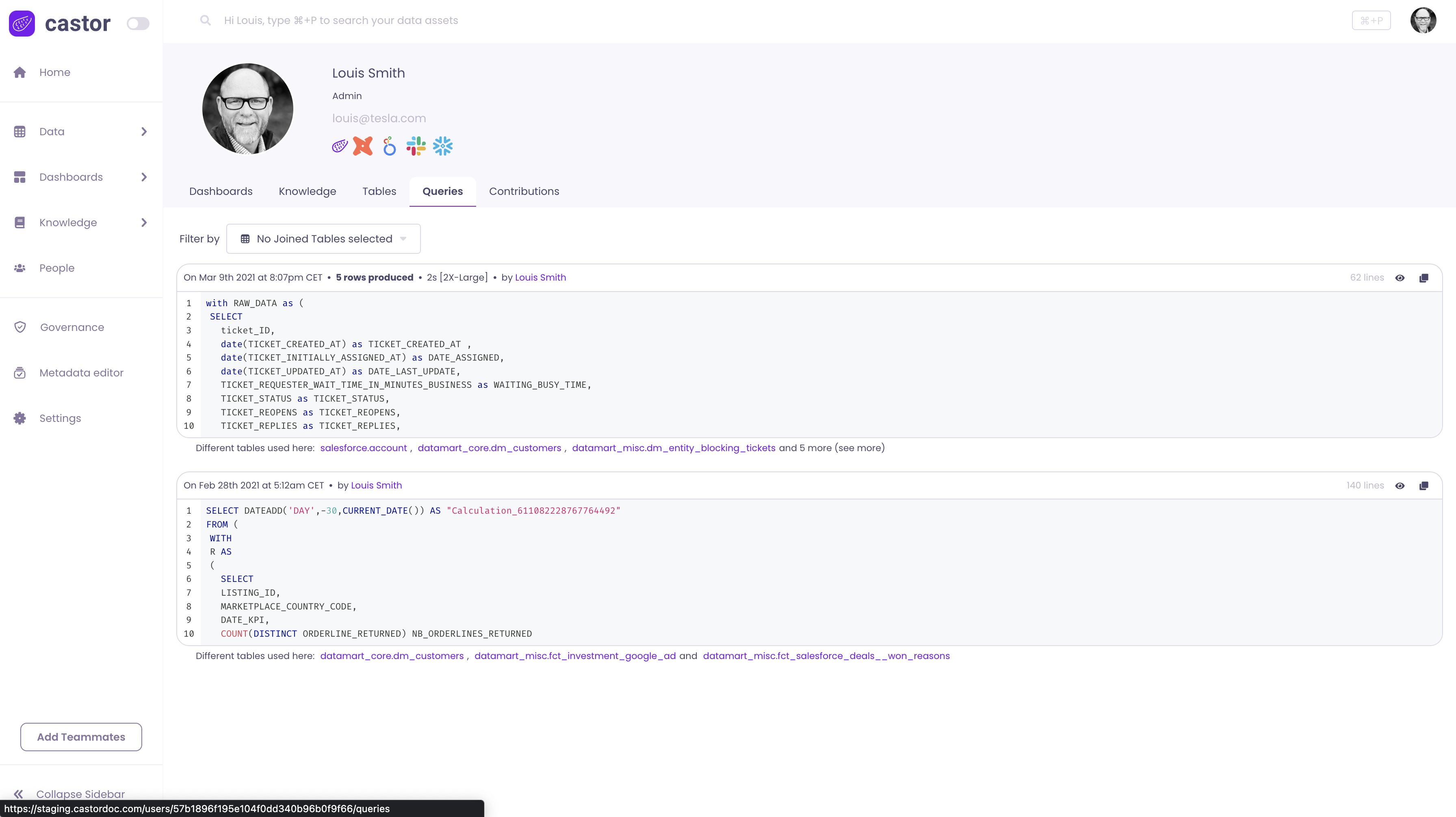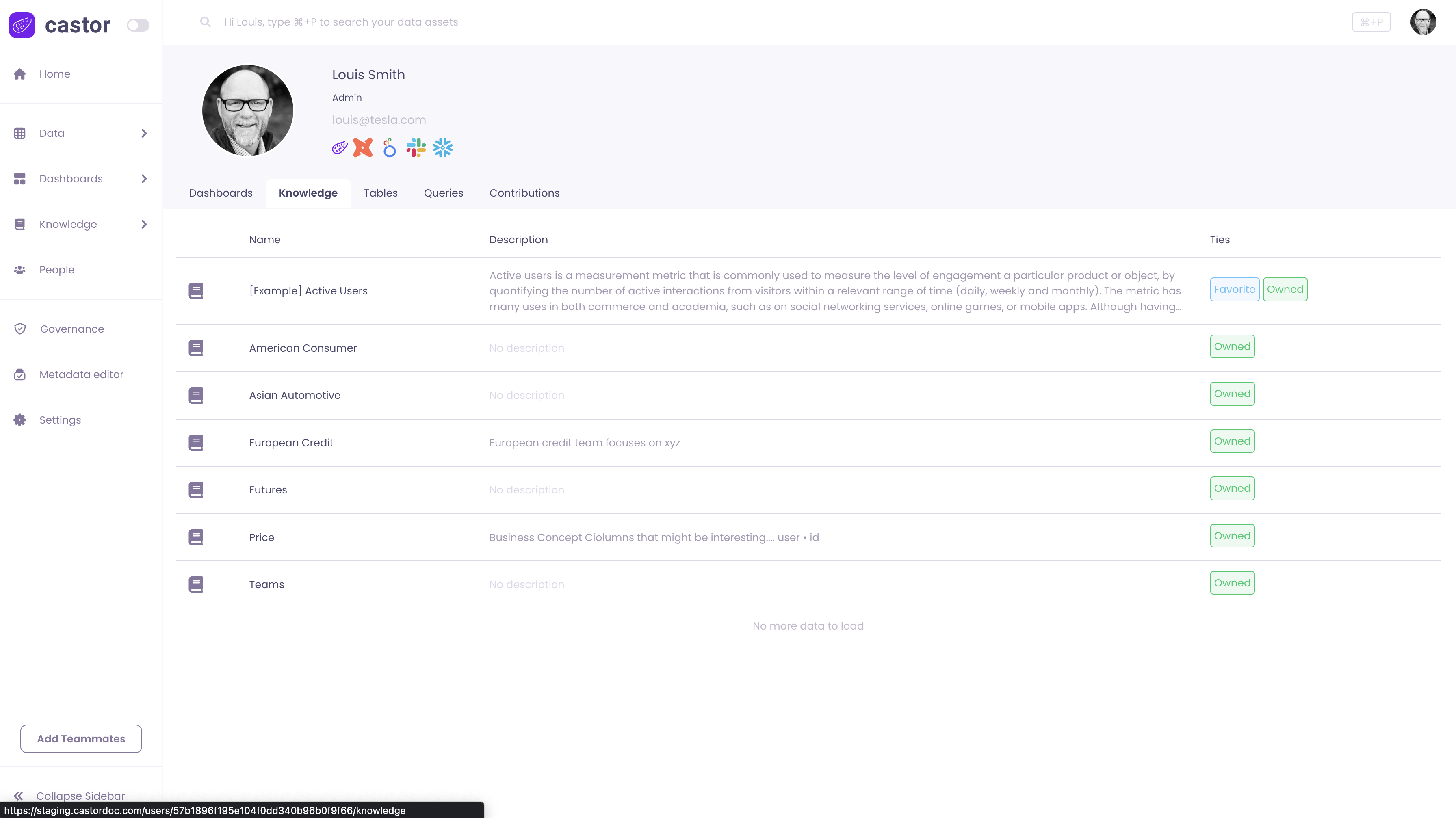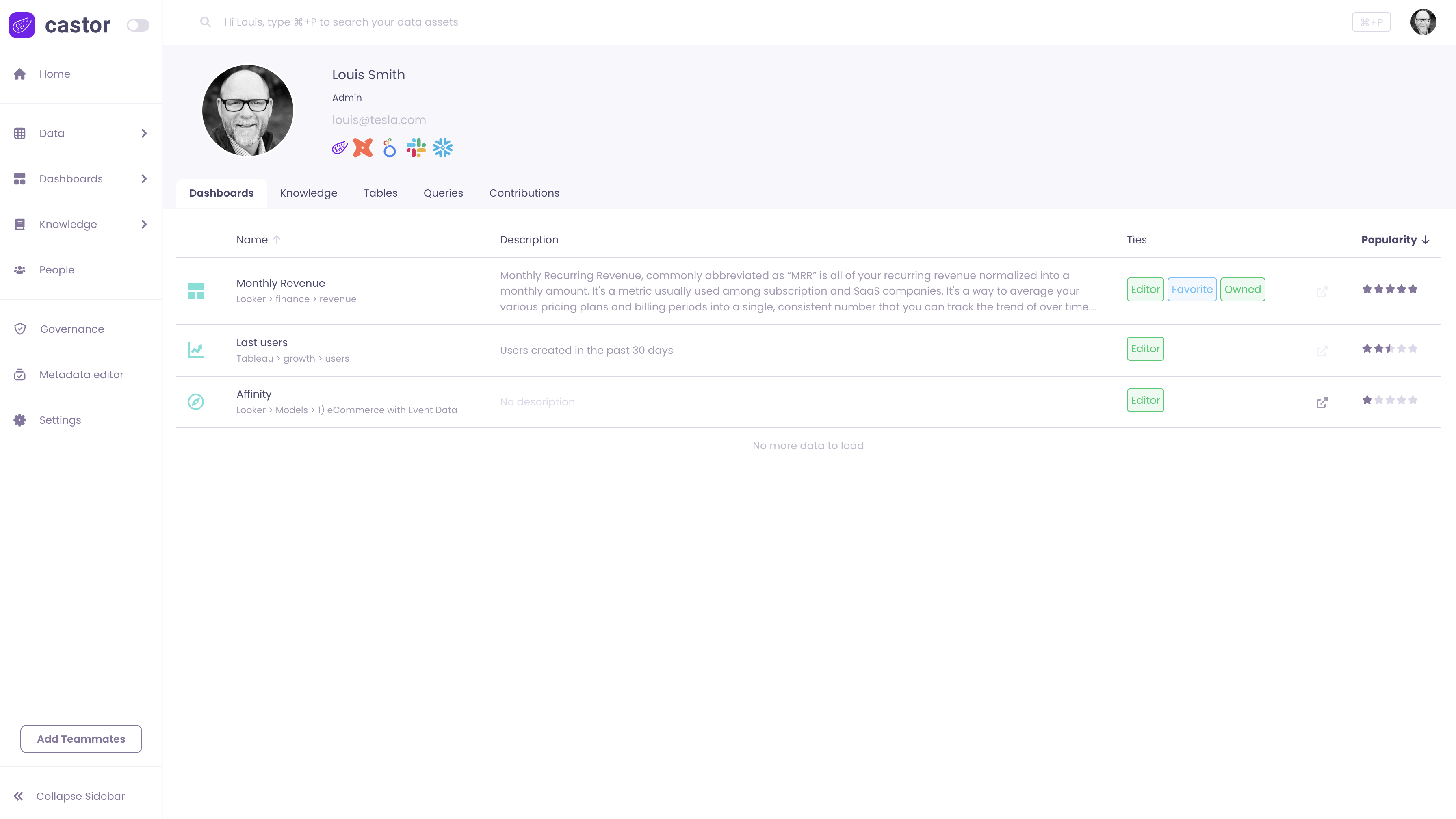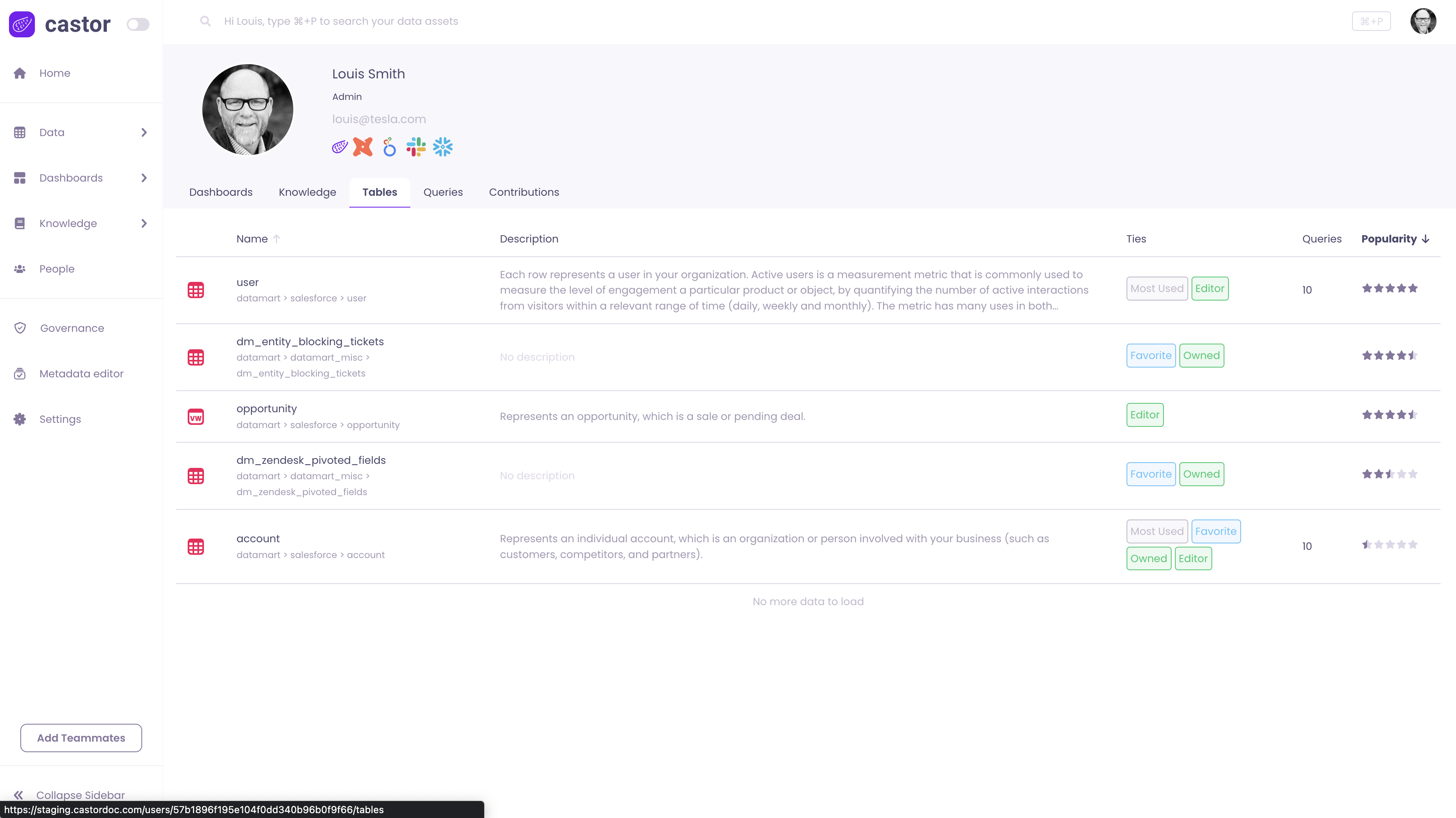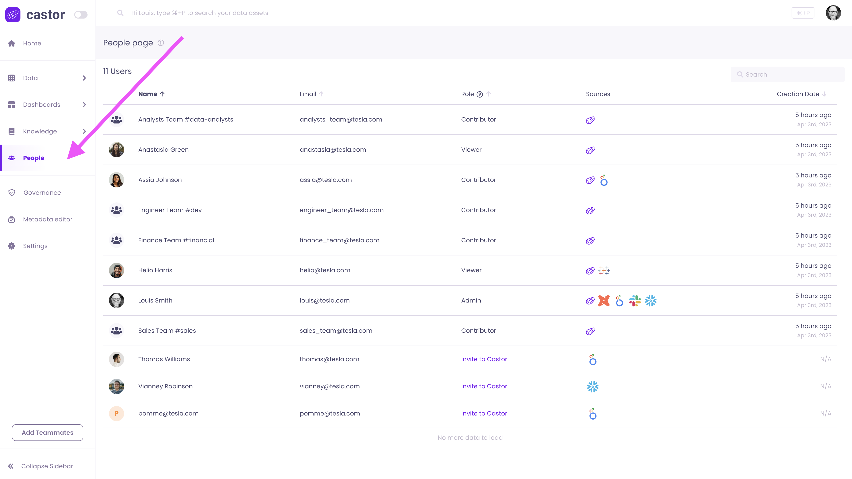 This page provides a list of users and their respective information that is relevant to your organization. Here, you can find email addresses, roles (admin, contributor, viewer), sources where they are connected, creation dates for the accounts, and links to their profiles. This information can be useful for discovering your data.
