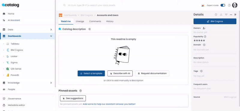 Under the dashboard section you are going to find assets synchronised from your Business Intelligence and Analytics platforms. Here is where you will be able to find semantic models or data sets as well as dashboards and reports.