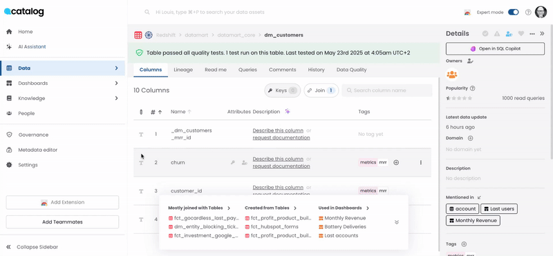 Similarly, for column documentation, ensure you add a short description of the meaning of the column, enumerate values if it is a an enum type, consider creating a knowledge page and pin it (see Pinned assets & Mentions) if it represents a major metric of business concept.