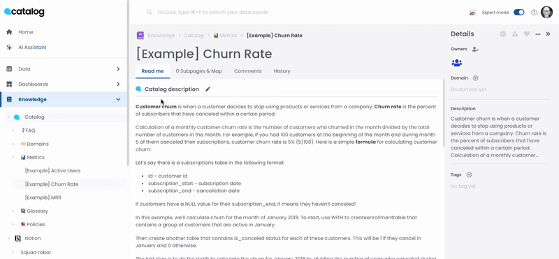 π‘ Putting metrics under a domain or a team bears the risk of adding multiple definitions for the same business concept. For that reason we recommend having a separate section for metrics that is either flat or is only grouped by the type of metric (and not by domain, team etc).