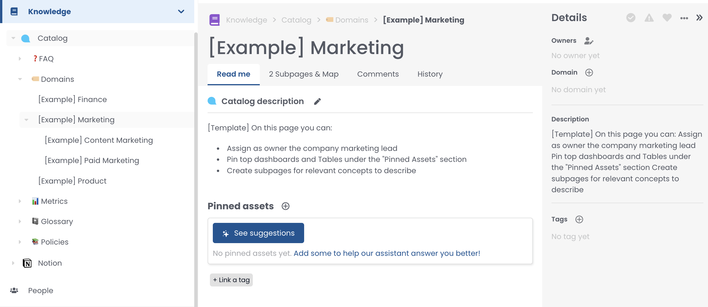 You can think of the knowledge section as the place where you link the business concepts and definitions to data assets.