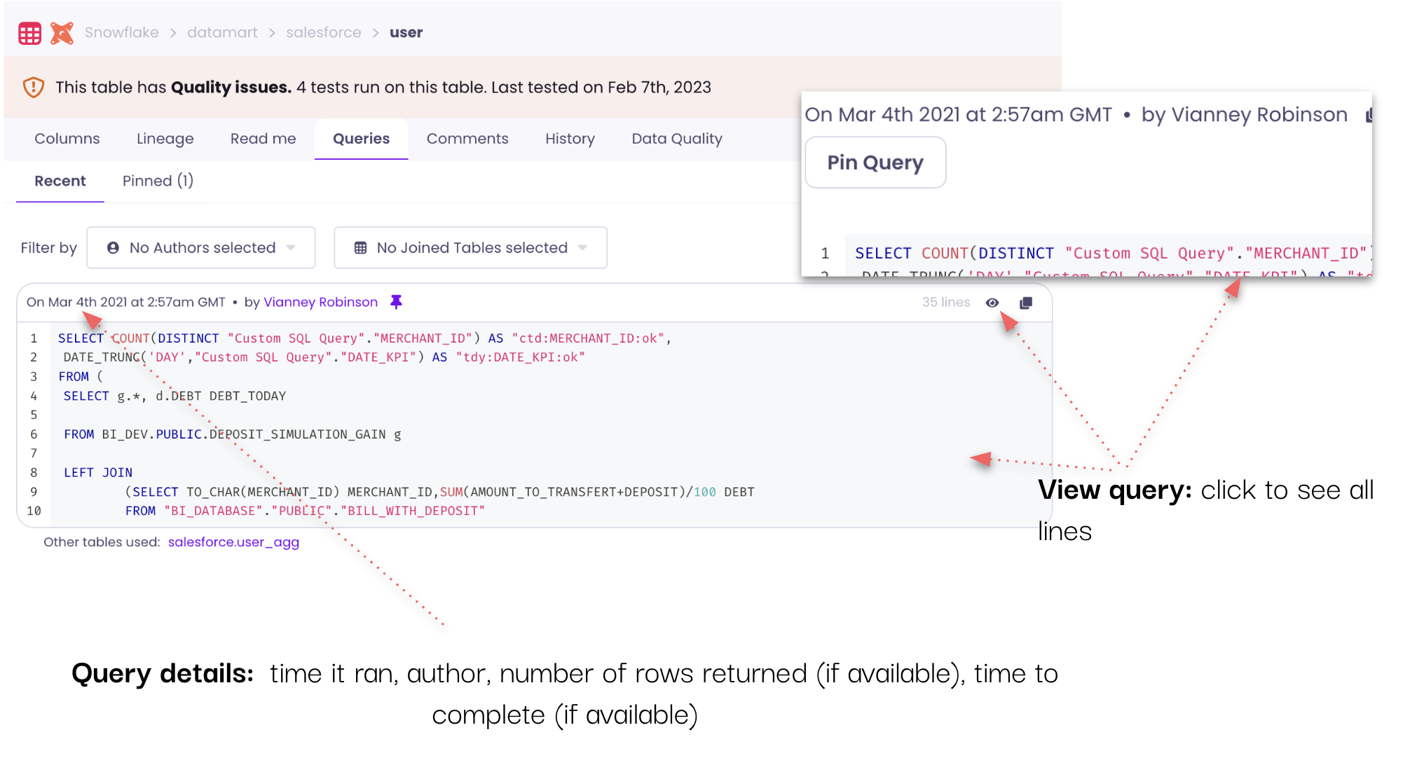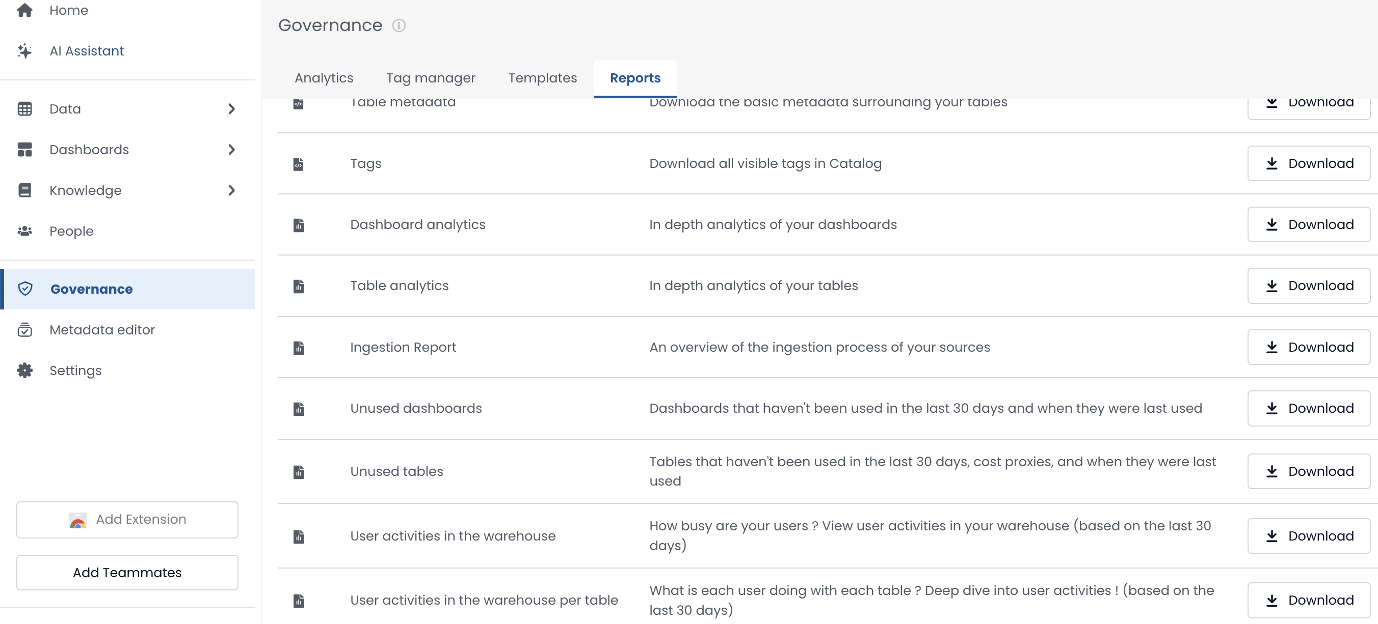 'User Activities' & 'Table Analytics' reports can be found under the Reports tab of your Governance section and offer information on queries by user and tables. This information can be used to identify improvement opportunities: e.g. a high query run time against a table or tables with many hits.