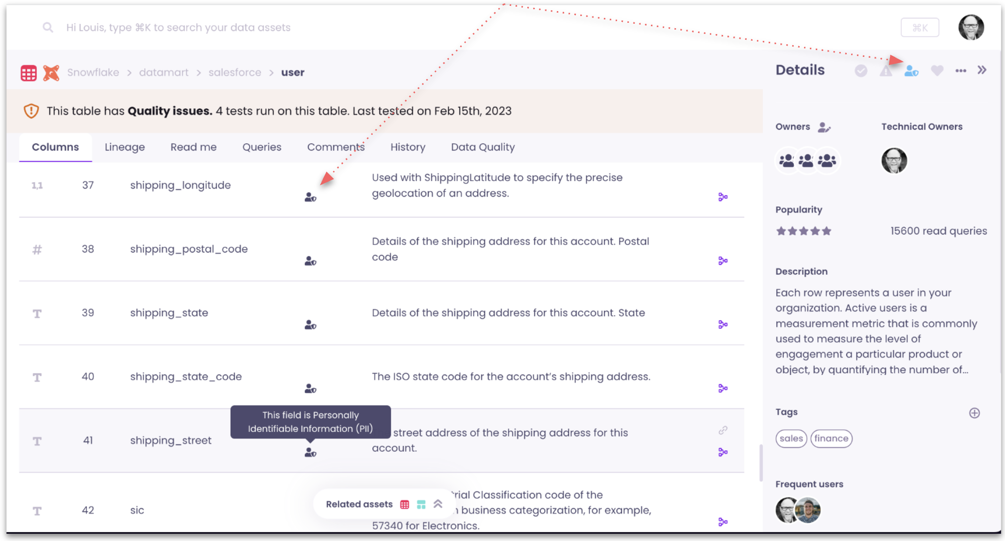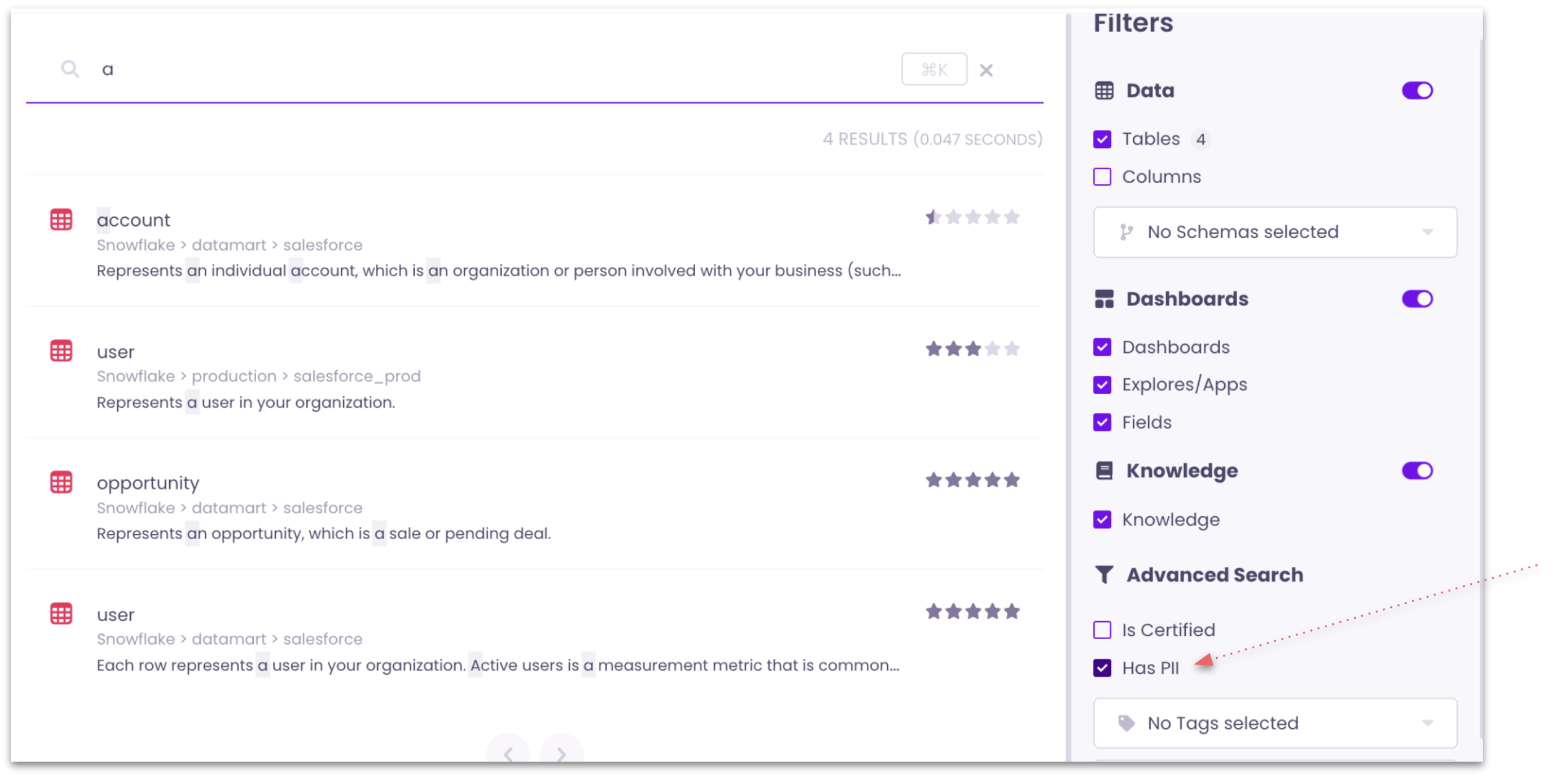Catalog can help you identify your PII. How does it work? Catalog can highlight columns that are likely to include PII based on the metadata received.