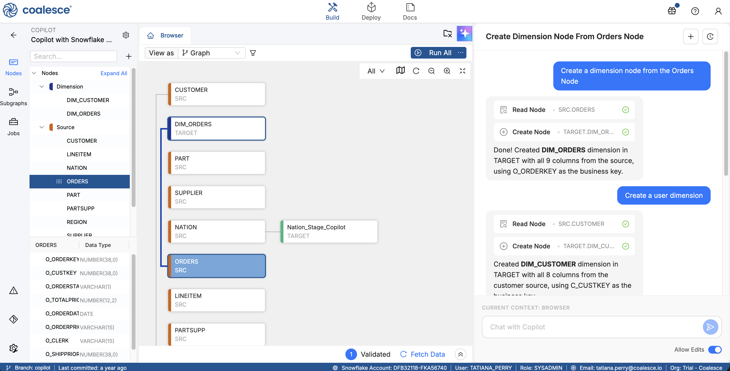 Think of it as a proficient Coalesce teammate. You describe your data needs in plain English or paste SQL, and Copilot translates that into actual DAG Nodes with proper transformations, columns, and relationships.