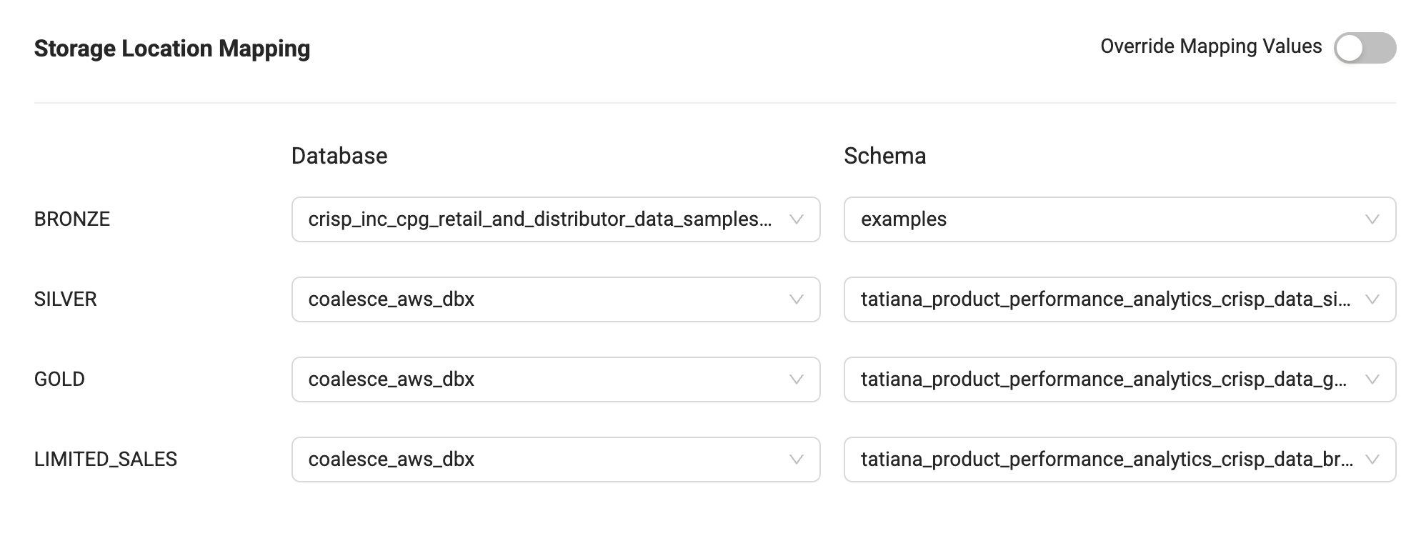 In this example, one of the Storage Locations created is SILVER and it's mapped to the database and schema coalesce_aws_dbx.tatiana_product_performance_analytics.